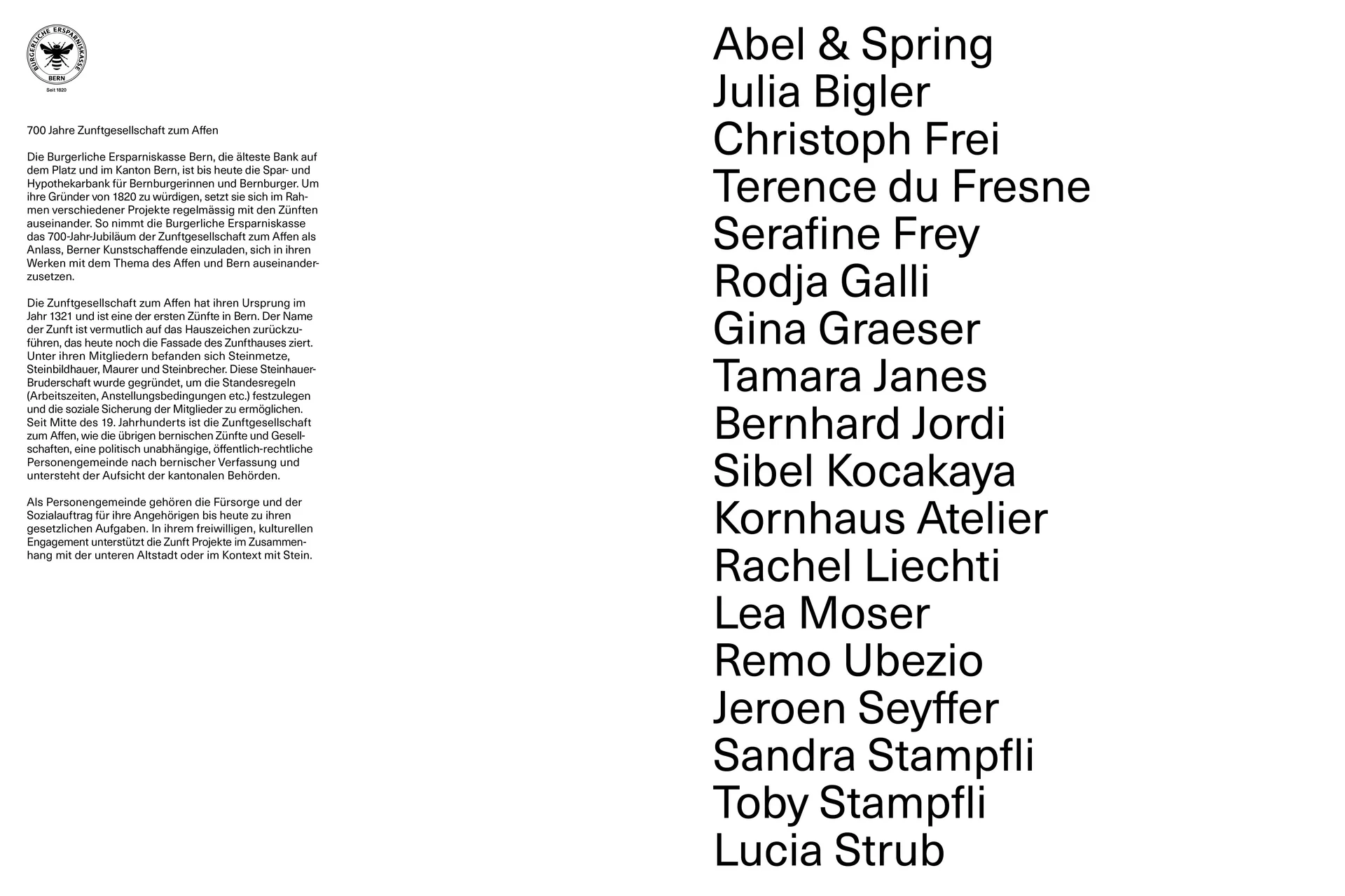 Die Burgerliche Ersparniskasse Bern, die älteste Bank auf dem Platz und im Kanton Bern, ist bis heute die Spar- und Hypothekenbank für Bernburgerinnen und Bernburger. Um die Gründer von 1820 zu würdigen, setzt sich die Burgerliche Ersparniskasse Bern im Rahmen verschiedener Projekte regelmässig mit den Zünften auseinander. So wurde das 700-Jahr-Jubiläum der Zunftgesellschaft zum Affen zum Anlass genommen, Berner Kunstschaffende einzuladen, sich in ihren Werken mit dem Thema des Affen und Bern auseinanderzusetzen.