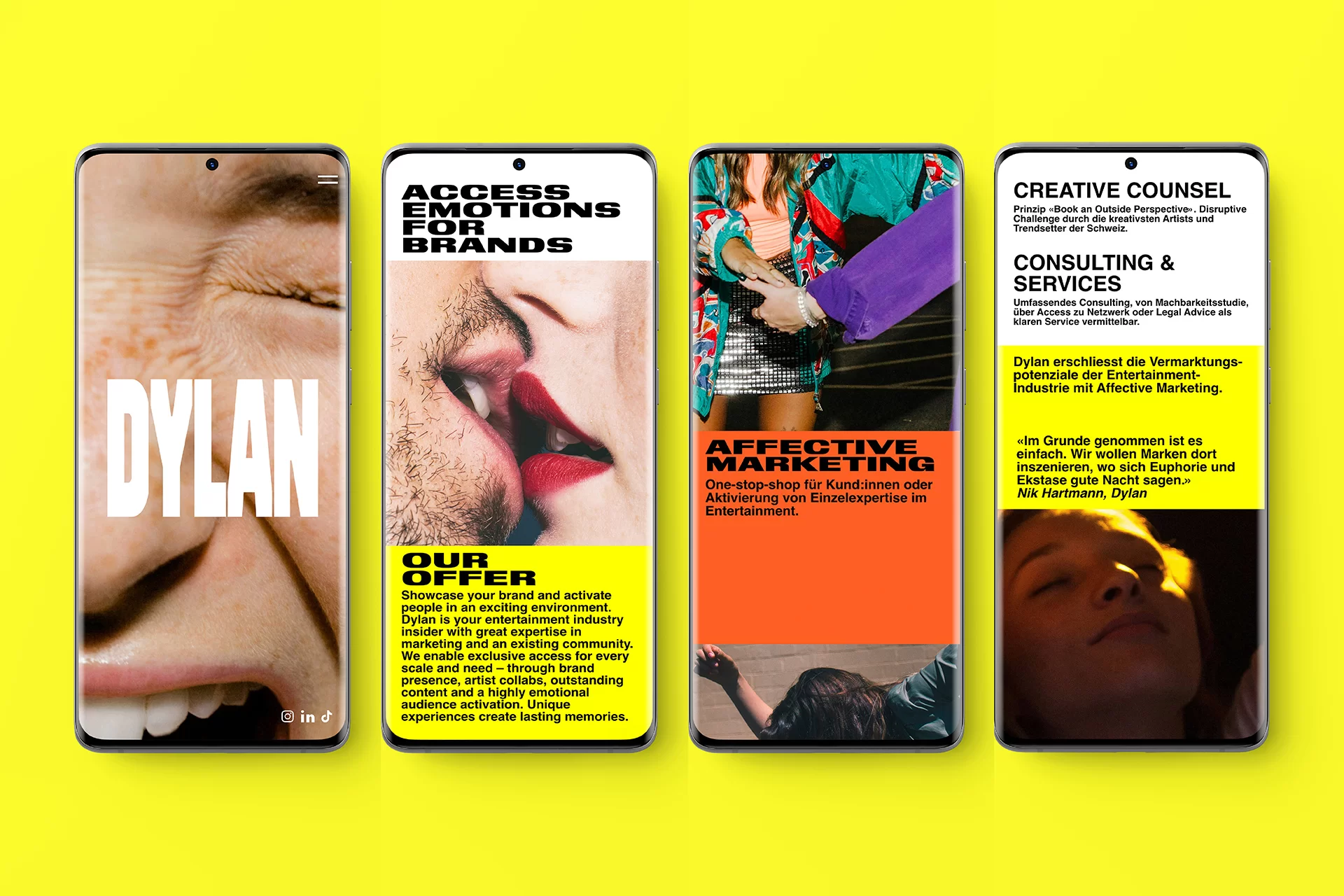 Studio Thom Pfister gestaltet den Markenauftritt für DYLAN. Mit einer kraftvollen und frischen Bildsprache, kombiniert mit einer passenden Wortmarke DYLAN als Logo. «Access Emotions», Studio Thom Pfister übersetzt diese Vision in ein kreatives Markenerlebnis, das Event, Marke, Kraft und Musik transportiert. Die Website mit Programmierung erstellt das Studio-Team inhouse.