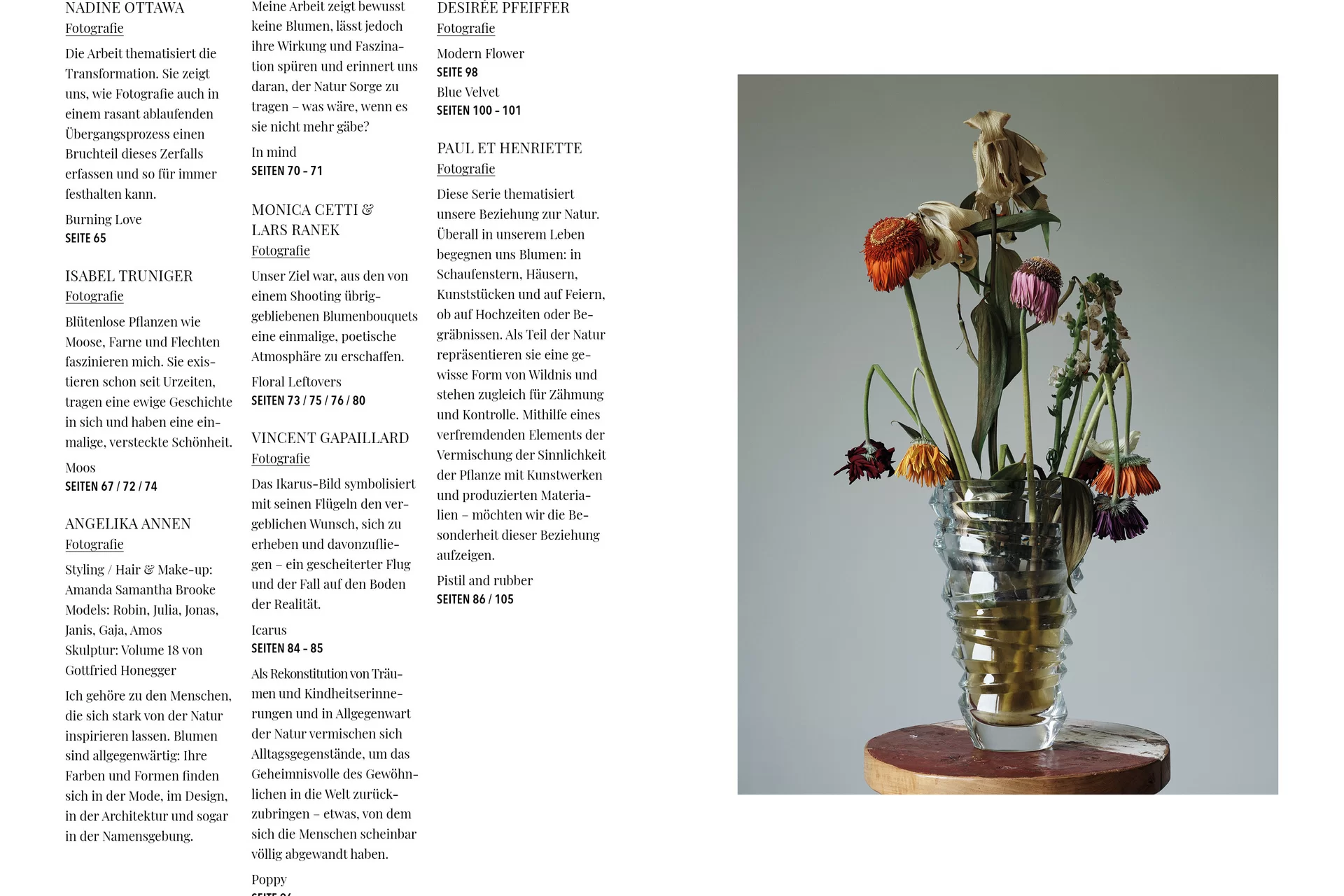 Melanie JeanRichard begeistert Ästheten mit ihren einzigartigen Kreationen aus mediterranen Blumen. Zu ihrem Jubiläum gestalten wir für die Berner Floristin einen neuen Auftrifft, der von einem besonderen Kunstprojekt inspiriert und begleitet wird. Ihre Werke verbinden Menschen mit kreativem und künstlerischem Anspruch. Diejenigen, die mit ihren schwarz-weiss eingehüllten Trouvaillen durch Bern spazieren, werfen sich lächelnd wissende Blicke zu. Gemeinsam mit ihrem Team inszeniert Melanie JeanRichard mediterrane Blumen auf unverwechselbare Art - zuerst auf dem Berner Markt, dann in einem kleinen Kellergeschäft und heute an der Münstergasse 72. Anlässlich ihres fast zehnjährigen Bestehens an der Münstergasse gestalten wir für Melanie JeanRichard nicht nur einen neuen Auftritt, sondern lassen ihre Kunst auch gleich von Künstlern feiern. Kuratiert von Studio Thom Pfister, inszenieren 28 Künstlerinnen und Künstler Blumen auf ihre ganz eigene Art - fotografisch oder malerisch, abstrakt oder konkret, filigran oder kraftvoll. Entstanden sind Bilder, die Geschichten erzählen: immer individuell, aber stets mit dem Anspruch, uns zu bewegen, zu inspirieren und unsere Sinne zu berühren. Ganz im Sinne von Melanie JeanRichard.