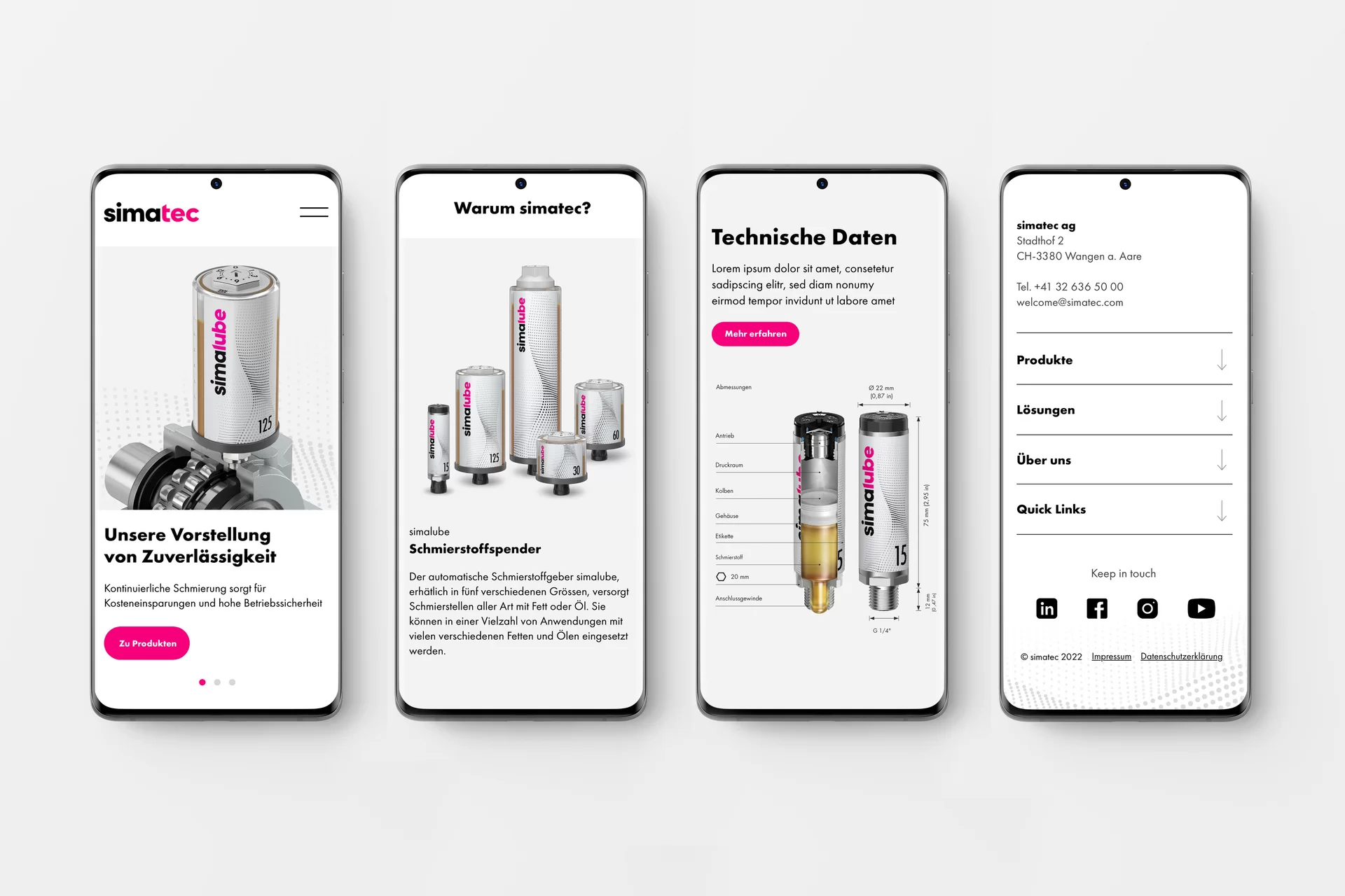 Die Dachmarke simatec und die Produktmarken simalube, simatherm und simatool wurden überarbeitet. Das neu entwickelte Designelement verbindet die einzelnen Marken. Die Bildwelt, Icons und Layouts der Drucksachen wurden neu definiert und das Screendesign für die Website wurde erstellt.